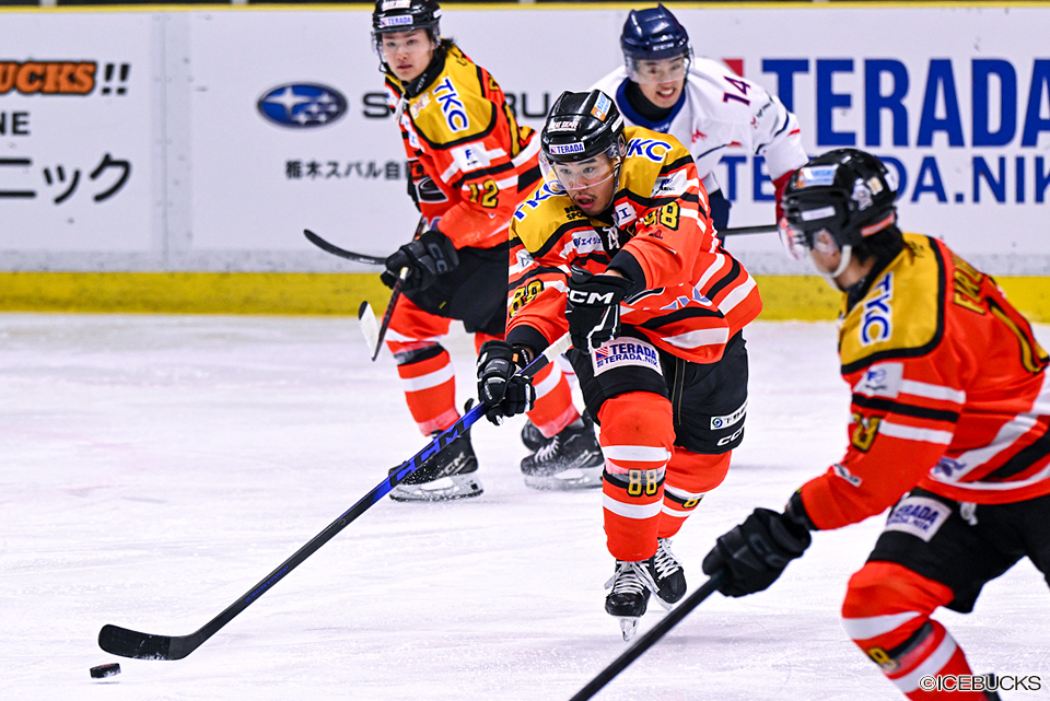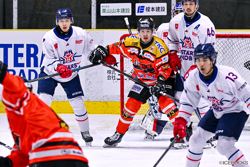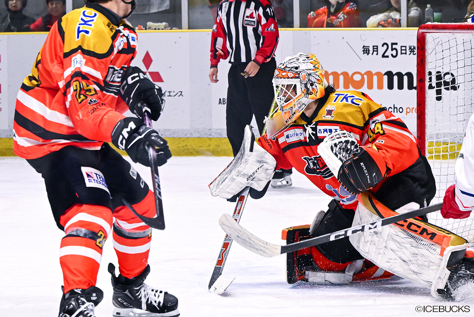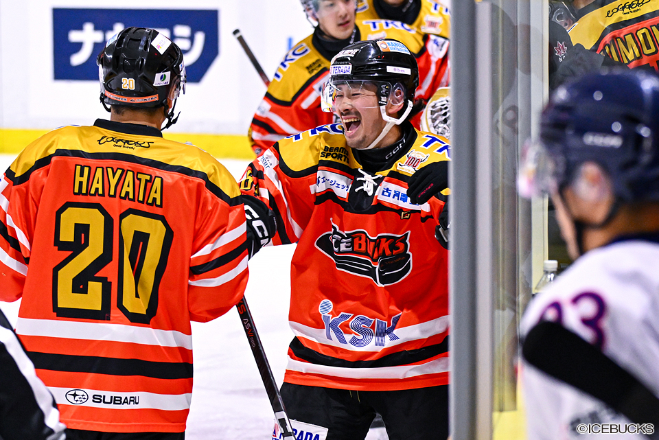 試合の立ち上がりは、少し間が空いた影響もあったのか、あまり自分たちの良いホッケーができている状態ではなかったと思います。ただ、1ピリオドを終えてからは徐々に良いシフトも増えてきて、最終的にゼロで終えられたという点は、今シーズン失点が少ない理由の一つでもある、守りがしっかりできた試合だったと思います。何度か相手にチャンスを与えてしまう場面はありましたが、2回、3回と攻撃に厚みを持たせなかったことや、リバウンド処理、セカンドアクションの部分が良く、失点せずに終えることができました。得点シーンについては、自分でフォアチェックに行った流れから、2番手が非常に速くサポートしてくれて、そこからパックを奪えたのが大きかったです。ゴール前に入ったところでパスが来てワンタイムで打ちましたが、相手のスティックも出ていて狙ったところには打てないと感じたので、とにかく枠に入れることを意識しました。結果的に空いているところに飛んでくれて、運も味方してくれたゴールだったと思います。