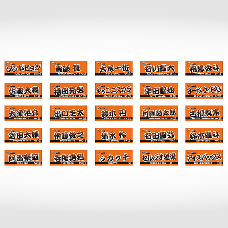 今回の新商品は、すでに試合会場にて販売を開始している選手別応援アイテム「選手別フェイスタオル」と「選手ミニアクリルスタンド」となります。