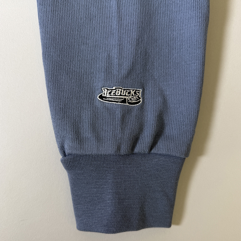 デザインには「ICE BUCKS HOCKEY」の文字をカレッジ風の筆記体であしらいました。観戦アイテムとしても日常使いとしてもおすすめです。
