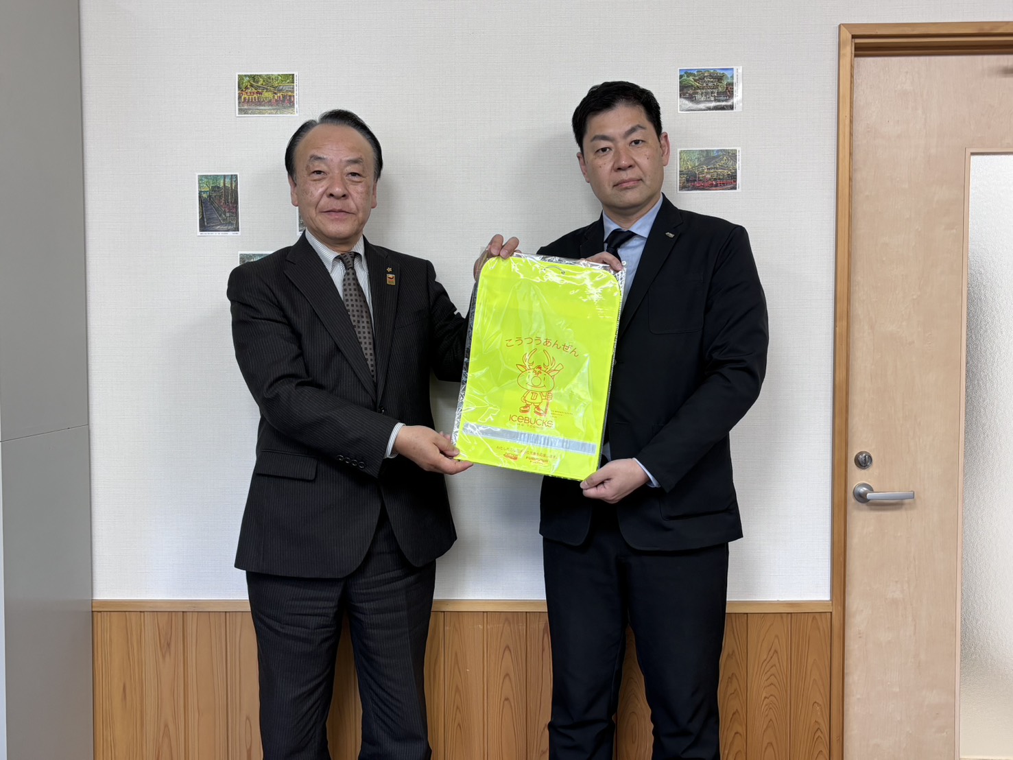 H.C.栃木日光アイスバックスは、3月17日(火)日光教育長 関孝和様を訪問し、昨年に引き続き令和8年度日光市立の新1年生全児童へアイスバックスオリジナルデザインの反射板付きランドセルカバーを寄贈させていただき、「古河電工SDGsパートナーシップ」の取り組みの一環として実施いたしました
