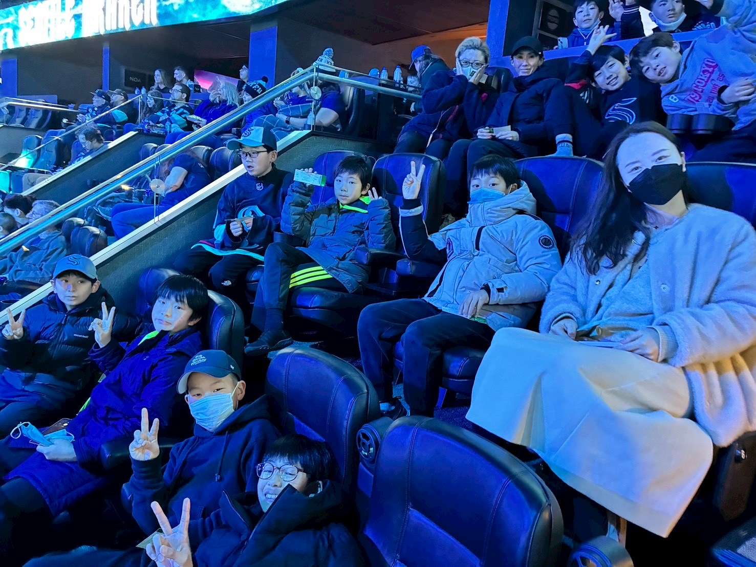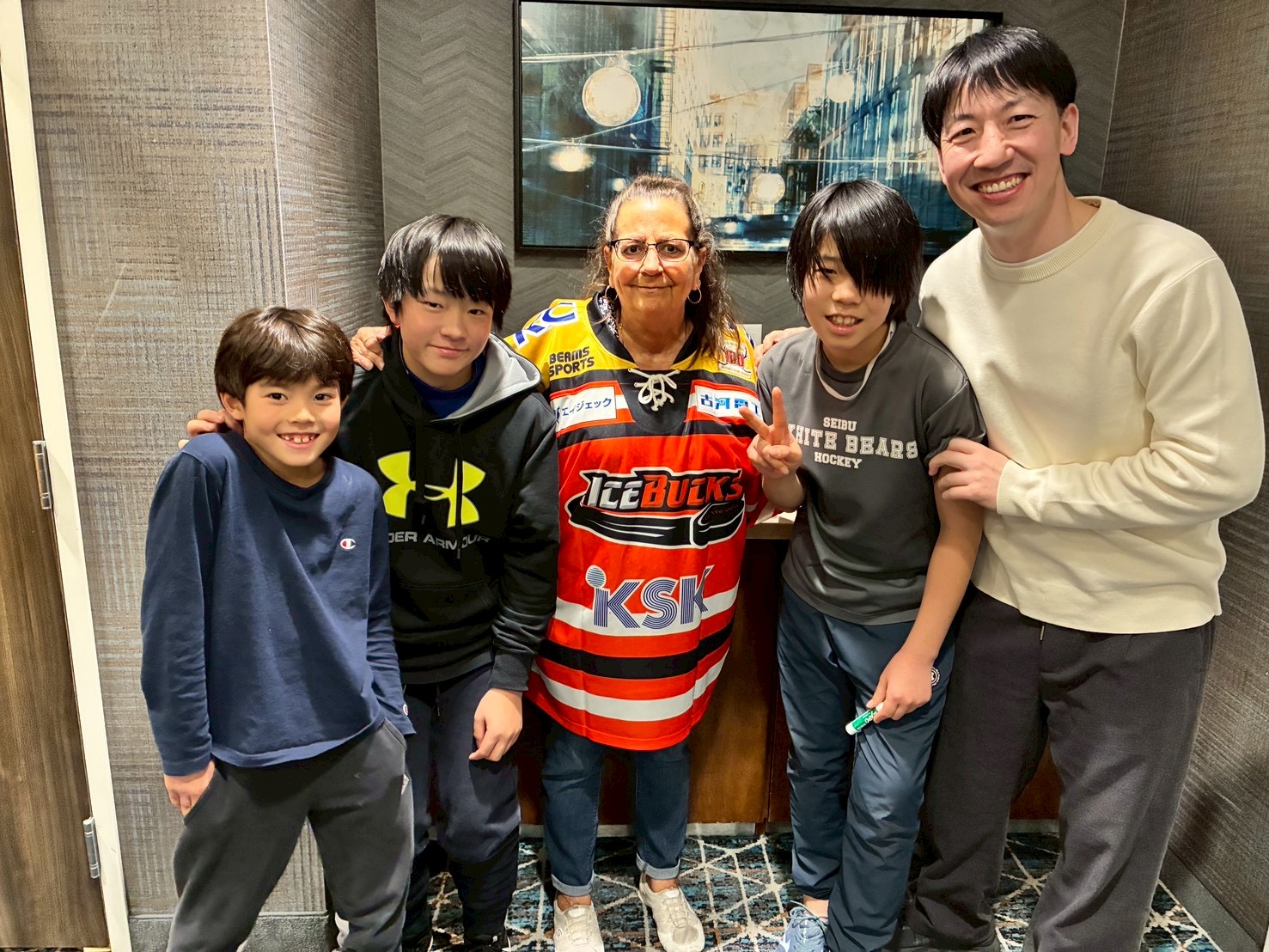 今回のご招待に対するお礼を直接お伝えし、記念撮影も行いました。あわせて、Lampmanさんのお名前が入ったアイスバックスのユニフォームをお渡しさせていただきました。リンクでの練習では、相手チームであるピッツバーグ・ペンギンズのカナダ代表キャプテン、シドニー・クロスビー選手を間近で見ることもでき、子どもたちは大興奮でした。